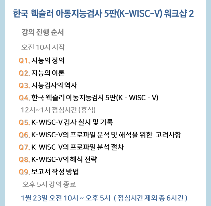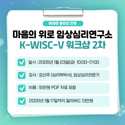 <마음의 위로 임상심리연구소에서 한국 웩슬러 아동지능검사 5판(K-WISC-V) 워크숍에 초대합니다>