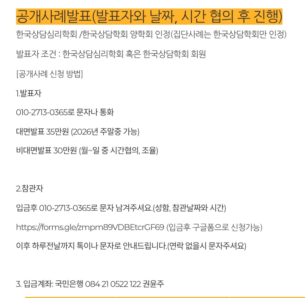 ■■양학회 공개사례발표■■집단리더패키지 상시모집(1년간 공개참관무료혜택)/공개사례발표 상시모집(집단/개인사례,날짜시간조율)발표자,참관자모집중(양학회 인정)