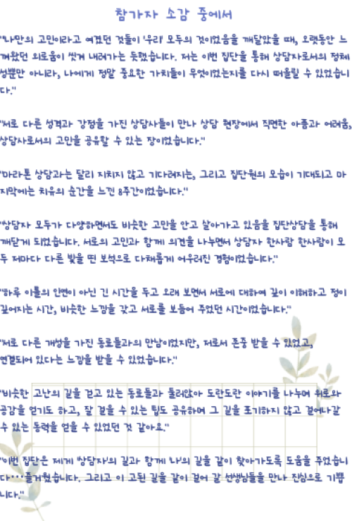 상담자로 살아간다는 것이 어떤 것인지 누구보다 잘 이해해 줄 다른 상담자들과 연결되고 싶은 분들, 상담자로서의 고민을 지지적이고 안전한 환경에서 진솔하고 심도있게 나누기를 원하는 분들, 긴 호흡의 집단도 경험해 보면서 상담자로서 한층 더 성장하고 싶은 분들, 서로에게 기대어 만드는 따듯한 온기 안에서 상담자로 더 깊어지고자 하는 분들과 함께 하고 싶습니다.