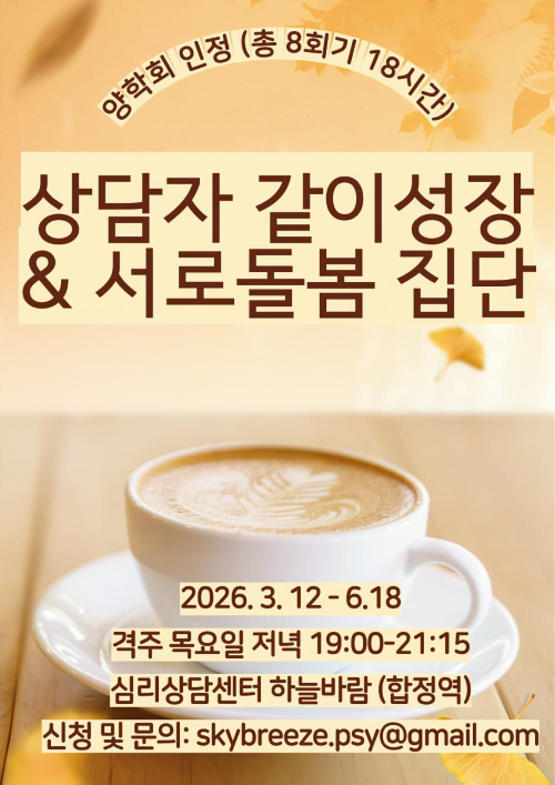[심리상담센터 하늘바람] 양학회 인정 상담자 같이성장 & 서로돌봄 집단 (3월-6월/격주 목요일/8회기 18시간)