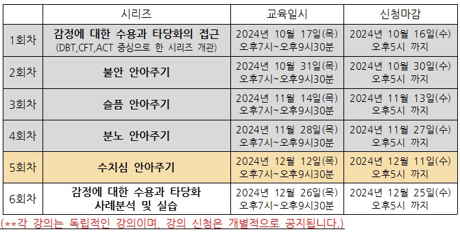 본 연구소에서는 이번 학기에 상담 현장에서 일하시는 상담자분들을 대상으로 감정에 대한 수용과 타당화에 초점을 맞춘 감정 안아주기 워크숍을 실시합니다.