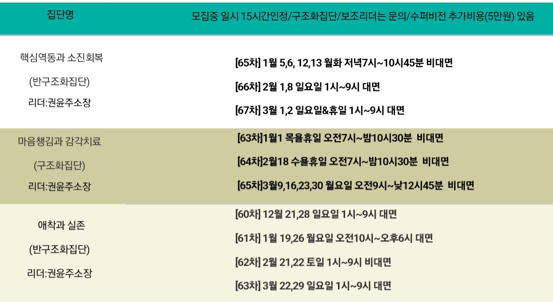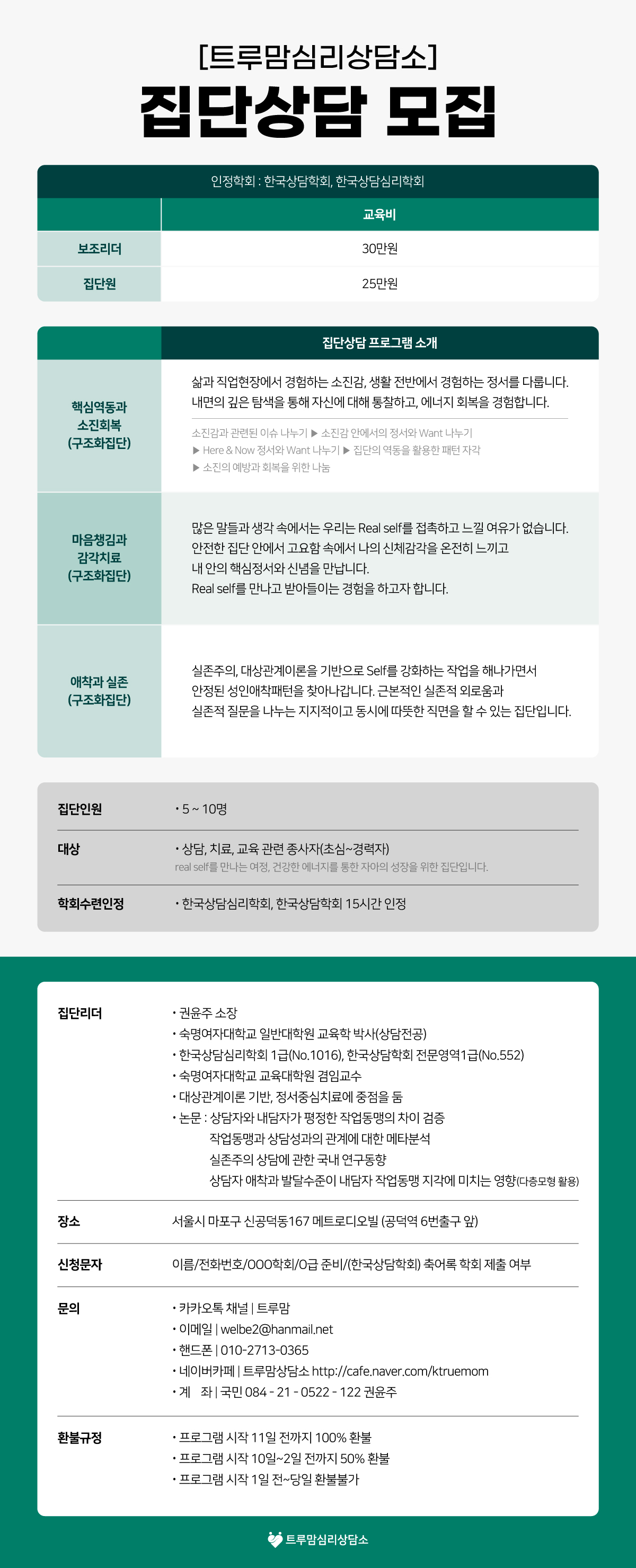 ##집단원25만원(학회추가비용없음),보조리더30만원(수퍼비전 추가비용5만원-총35만원)
