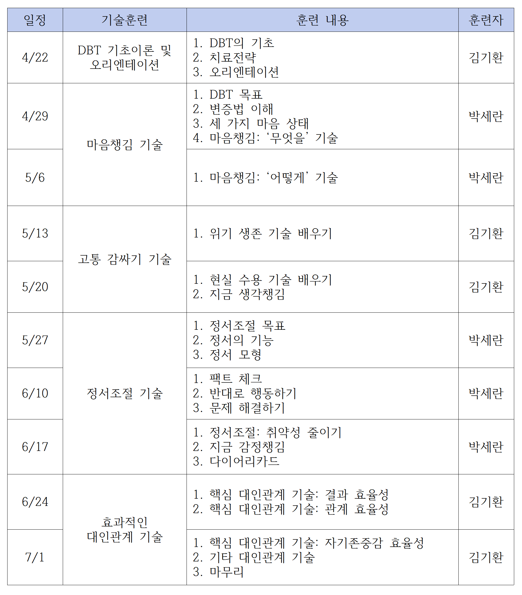 본 프로그램은 DBT 전문가들이 지도하는 기술훈련 그룹으로 강의, 실습 및 피드백, 과제 점검 등으로 구성됩니다.
