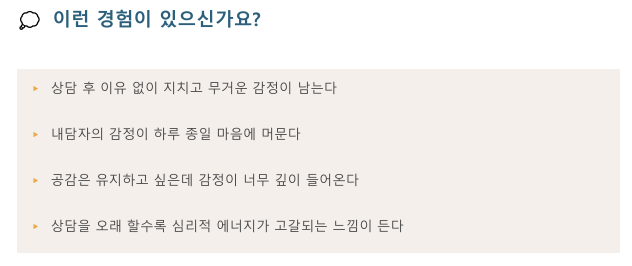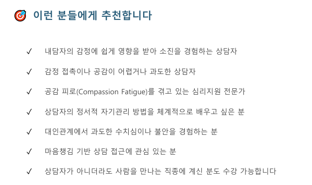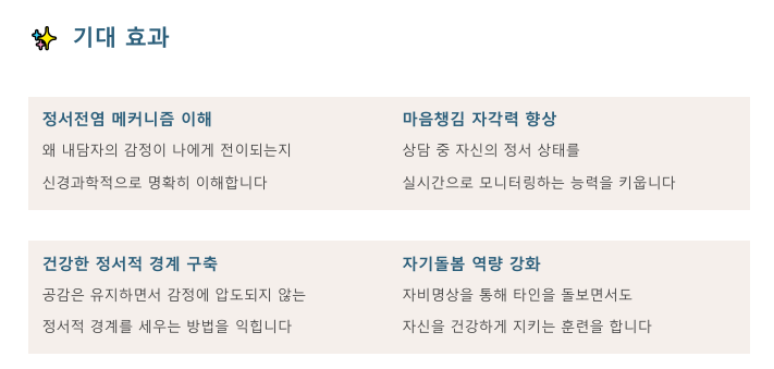 단순히 감정을 차단하는 것이 아니라, 공감은 유지하면서도 타인의 고통에 압도되지 않는 상담자의 ‘정서적 면역력’을 기르는 것이 이 프로그램의 핵심 목표입니다.